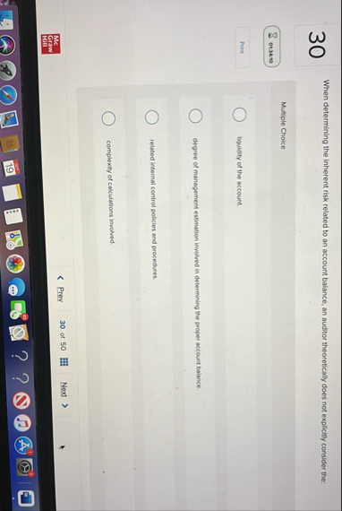 When determining the inherent risk related to an account balance, an auditor theoretically does not explicitly consider the: