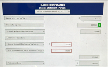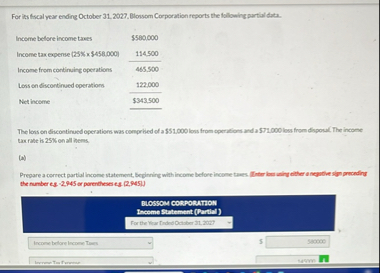 suvem\table[[\table[[BLOSSOM CORPORATHOM Income Statement (Partial)],[For the Year Ended Octrober 31, 2027]]],[Income belore lecome Thans,,5,],[Income Tax. Expense,,,