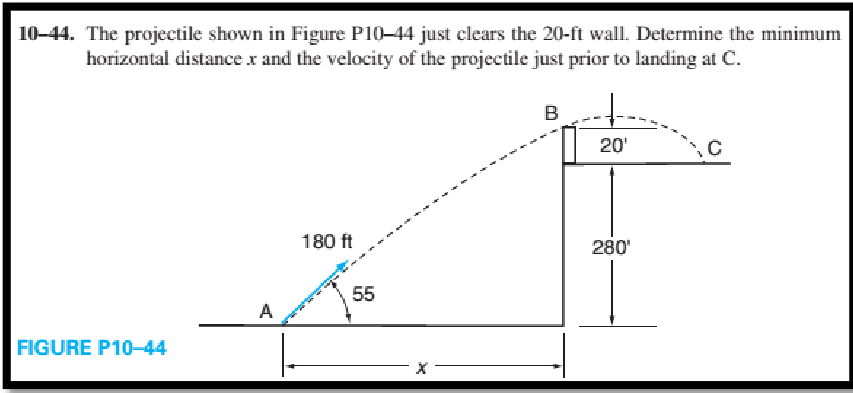 10-44. The projectile shown in Figure P10-44 just clears the 20-ft wall. Determine the minimum horizontal distance x and the velocity of the projectile just prior to landing at C. T20 C 180 ft 280 FIGURE P10-44 10-44. The projectile shown in Figure P10-44 just clears the 20-ft wall. Determine the minimum horizontal distance \( x \) and the velocity of the projectile just prior to landing at C . FIGURE P10-44