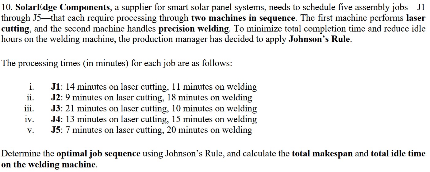 10. SolarEdge Components, a supplier for smart solar panel systems, needs to schedule five assembly jobs-J1 through J5-that each require processing through two machines in sequence. The first machine performs laser cutting, and the second machine handles precision welding. To minimize total completion time and reduce idle hours on the welding machine, the production manager has decided to apply Johnson's Rule. The processing times (in minutes) for each job are as follows: i. J1: 14 minutes on laser cutting, 11 minutes on welding ii. J2: 9 minutes on laser cutting, 18 minutes on welding iii. J3: 21 minutes on laser cutting, 10 minutes on welding iv. J4: 13 minutes on laser cutting, 15 minutes on welding v. J5: 7 minutes on laser cutting, 20 minutes on welding Determine the optimal job sequence using Johnson's Rule, and calculate the total makespan and total idle time on the welding machine.