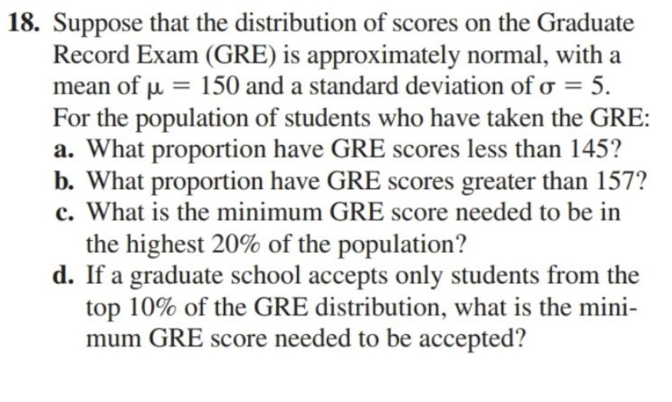 18. Suppose that the distribution of scores on the Graduate Record Exam (GRE) is approximately normal, with a mean of \( \mu=150 \) and a standard deviation of \( \sigma=5 \). For the population of students who have taken the GRE: a. What proportion have GRE scores less than 145 ? b. What proportion have GRE scores greater than 157 ? c. What is the minimum GRE score needed to be in the highest \( 20 \% \) of the population? d. If a graduate school accepts only students from the top \( 10 \% \) of the GRE distribution, what is the minimum GRE score needed to be accepted?