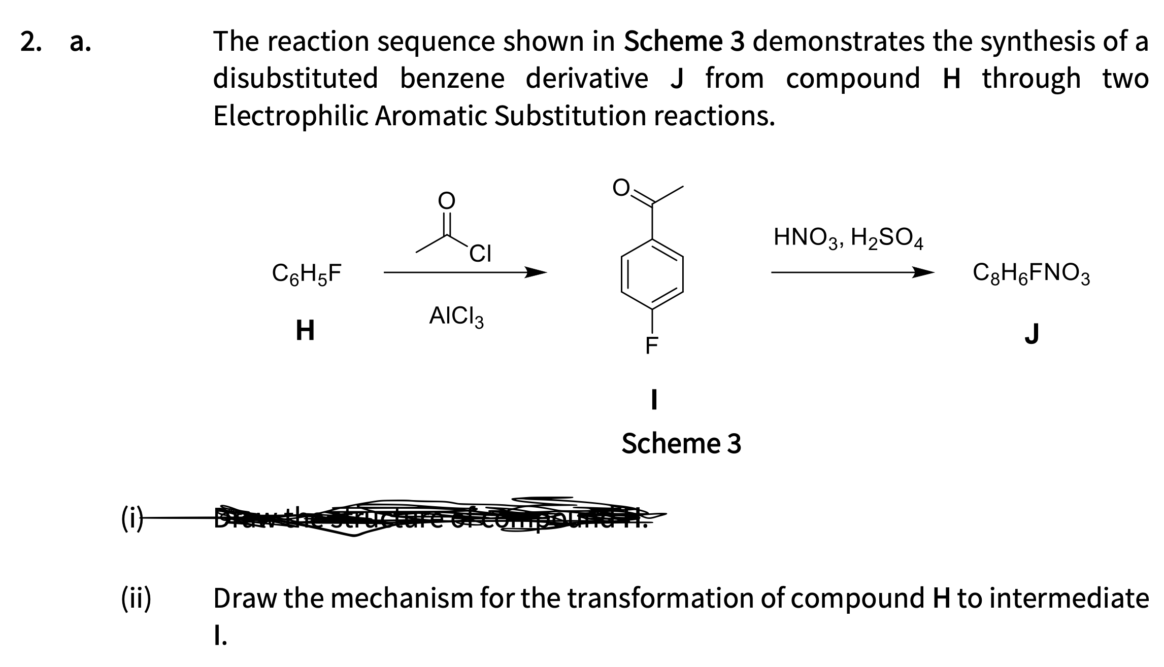 2. a. The reaction sequence shown in Scheme 3 demonstrates the synthesis of a disubstituted benzene derivative \( J \) from compound \( H \) through two Electrophilic Aromatic Substitution reactions. Scheme 3 (i) (ii) Draw the mechanism for the transformation of compound H to intermediate I.