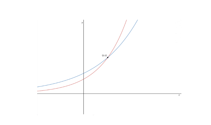 2. The figure below shows the graphs of the exponential functions described by \( f(x)= \) \( c \cdot 3^{x} \) and \( g(x)=d \cdot 2^{x} \) for some numbers \( c \) and \( d \). They intersect at the point \( (p, q) \). (a) Which is greater, \( c \) or \( d \) ? (b) Imagine you place the tip of your pencil at \( (p, q) \) and trace the graph of \( g \) out to the point with \( x \)-coordinate \( p+2 \). Imagine I do the same of the graph of \( f \). What will be the ratio of the \( y \)-coordinate of my ending point to the \( y \)-coordinate of yours?