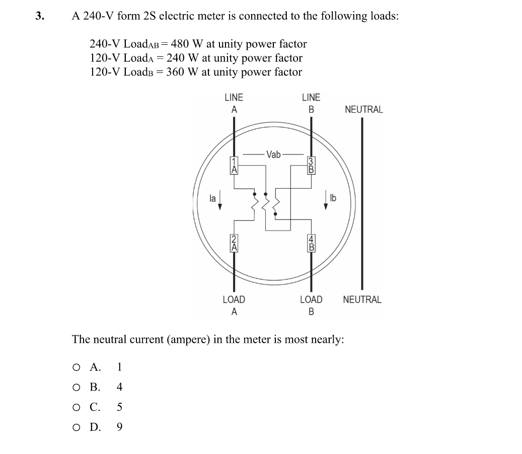 22. An overcurrent relay is used to protect a circuit with a maximum 3-phase fault current of 8000 A primary A 400:5 current transformer ratio and a 5-A relay tap setting are selected. If the total secondary burden on the current transformer for the maximum fault condition is 1:10n, the excitation voltage (V) that must be developed by the current transformer is most nearly a240-V form 2 S electric meter is connected to the following loads: