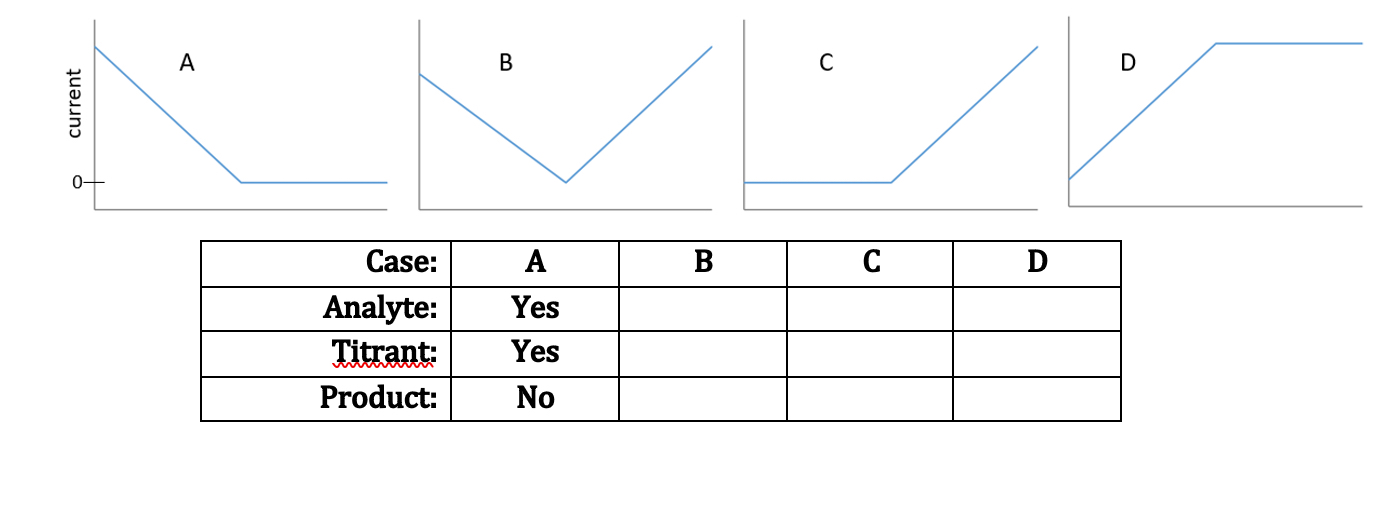 3.One way to perform an amperometric titration is to hold a working electrode at a constant potential and measure the working electrode current versus the amount of titrant added. Four possible titration curves are given below for the addition of a titrant to an analyte to produce a product. Fill in the table with either YES or NO to indicate which species are electroactive (that is, can be oxidized or reduced at the electrode).