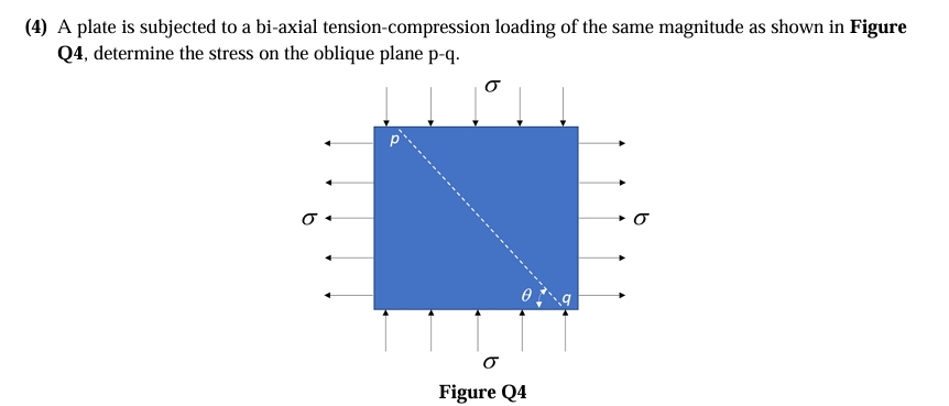 (4) A plate is subjected to a bi-axial tension-compression loading of the same magnitude as shown in Figure Q4, determine the stress on the oblique plane p-q.