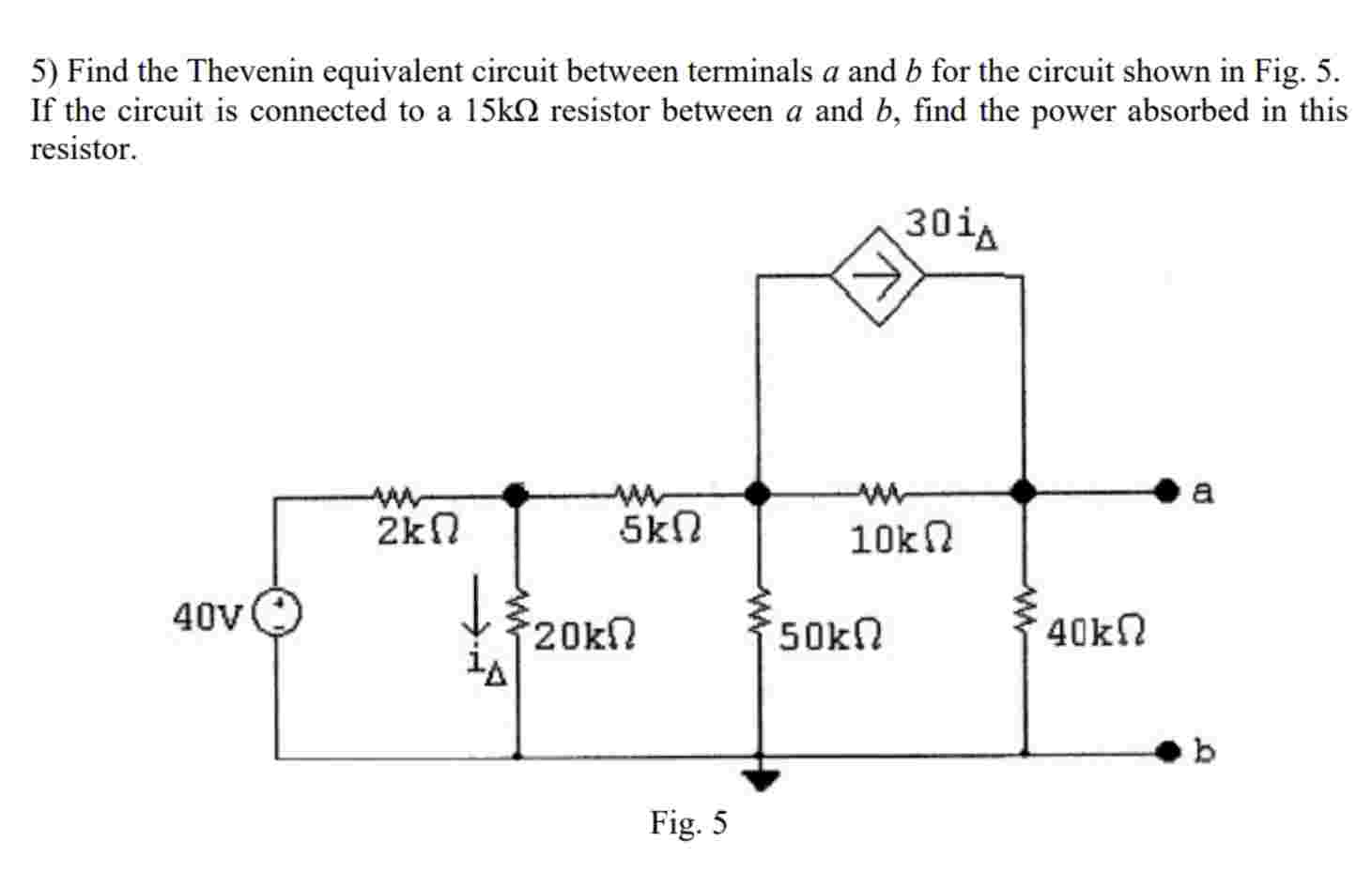 5) Find the Thevenin equivalent circuit between terminals \( a \) and \( b \) for the circuit shown in Fig. 5. If the circuit is connected to a \( 15 \mathrm{k} \Omega \) resistor between \( a \) and \( b \), find the power absorbed in this resistor. Fig. 5