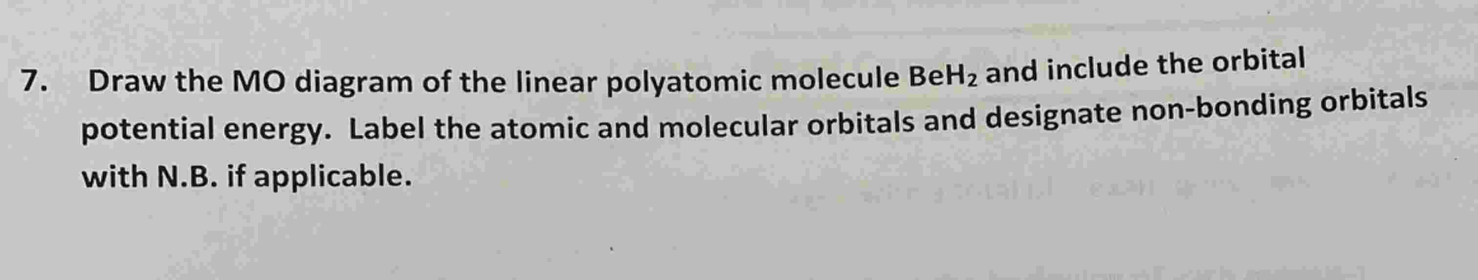 7. Draw the MO diagram of the linear polyatomic molecule \( \mathrm{BeH}_{2} \) and include the orbital potential energy. Label the atomic and molecular orbitals and designate non-bonding orbitals with N.B. if applicable.