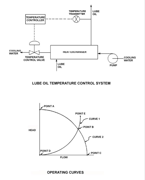 73)Refer to the drawing of a lube oil temperature control system and the associated pump/system operating curves (see figure below). The pump is initially operating at point B. If the temperature control valve modulates further open, operating point B will be located on curve __________ closer to point __________. A. 1; D B. 2; A C. 1; E D. 2; C The answer is D from the book. Can you explain why the answer is D graphically and mathematically?