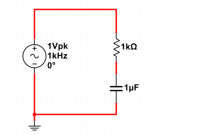 A 1k? resistor and a 1uF capacitor are placed in series across a 5VPP AC source at 1kHz.