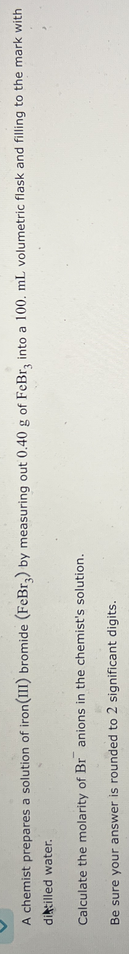 FeBr_(3)into a 100 . mL volumetric flask and filling to the mark with diatilled water. Calculate the molarity of