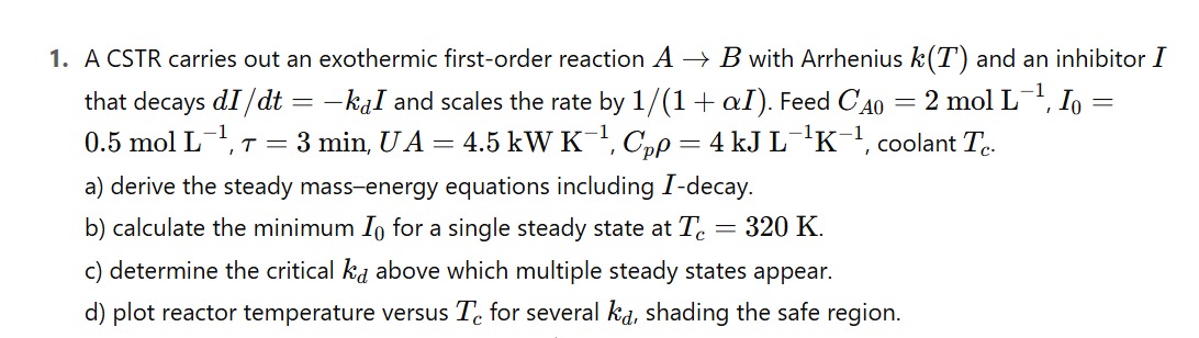A CSTR carries out an exothermic first-order reaction A->B with Arrhenius k(T) and an inhibitor I