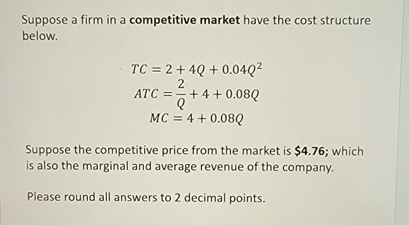 a) Draw a graph at the firm level to show the equilibrium quantity at the intersection of the Marginal Revenue and Marginal Cost. Call this Graph 2.1 b) Suppose (everything else remaining the same) the government decides to give a subsidy to this firm which is worth $2 (independent of production). How would firm production, price, quantity produced, profit be affected in the short run? c) Draw another graph, call it Graph 2.2 to show what changes in part b compared to part a.