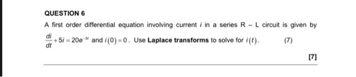 and i(0)=0. Use Laplace transforms to solve for i(t). [7]
