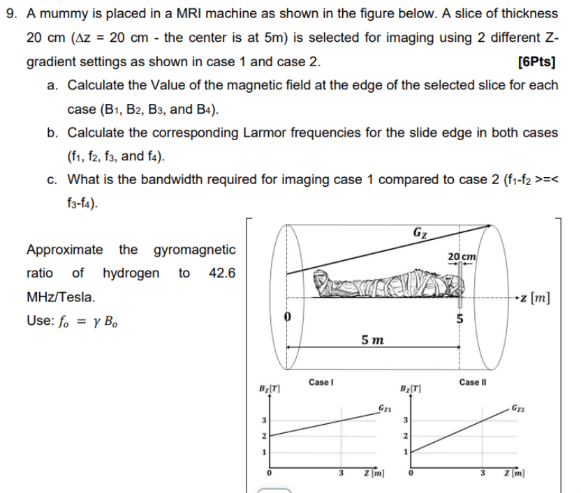 A mummy is placed in a MRI machine as shown in the figure below. A slice of thickness 20 cm (z = 20 cm - the center is at 5m) is selected for imaging using 2 different Zgradient settings as shown in case 1 and case 2. [6Pts] a. Calculate the Value of the magnetic field at the edge of the selected slice for each case (B1, B2, B3, and B4). b. Calculate the corresponding Larmor frequencies for the slide edge in both cases (f1, f2, f3, and f4). c. What is the bandwidth required for imaging case 1 compared to case 2 (f1-f2 >=< f3-f4). Approximate the gyromagnetic ratio of hydrogen to 42.6 MH(z)/(T)esla. Use: fo = \gamma ????�