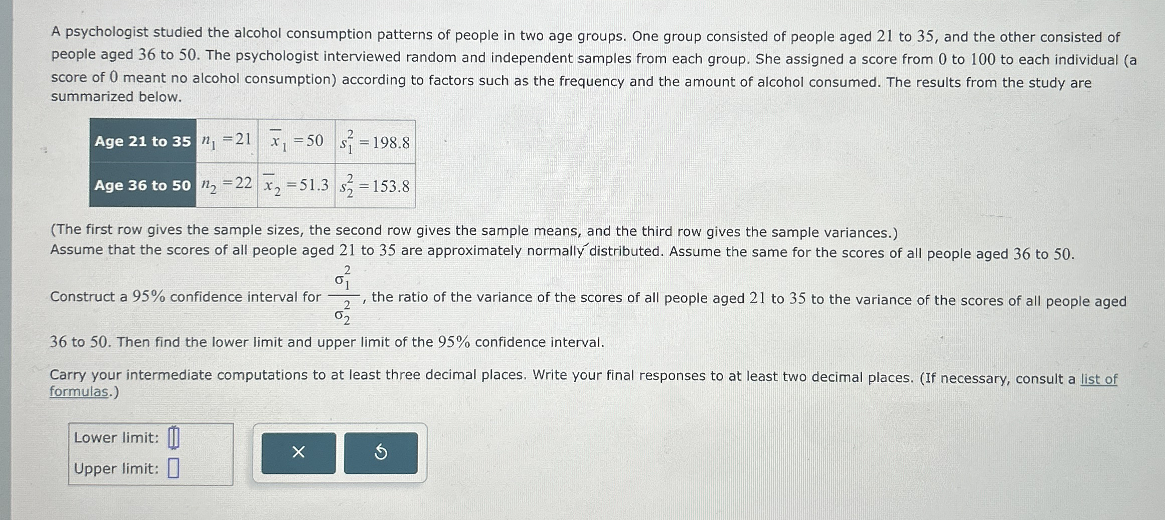 A psychologist studied the alcohol consumption patterns of people in two age groups. One group consisted of people aged 21 to 35 , and the other consisted of people aged 36 to 50 . The psychologist interviewed random and independent samples from each group. She assigned a score from 0 to 100 to each individual (a score of 0 meant no alcohol consumption) according to factors such as the frequency and the amount of alcohol consumed. The results from the study are summarized below. \table[[Age 21 to