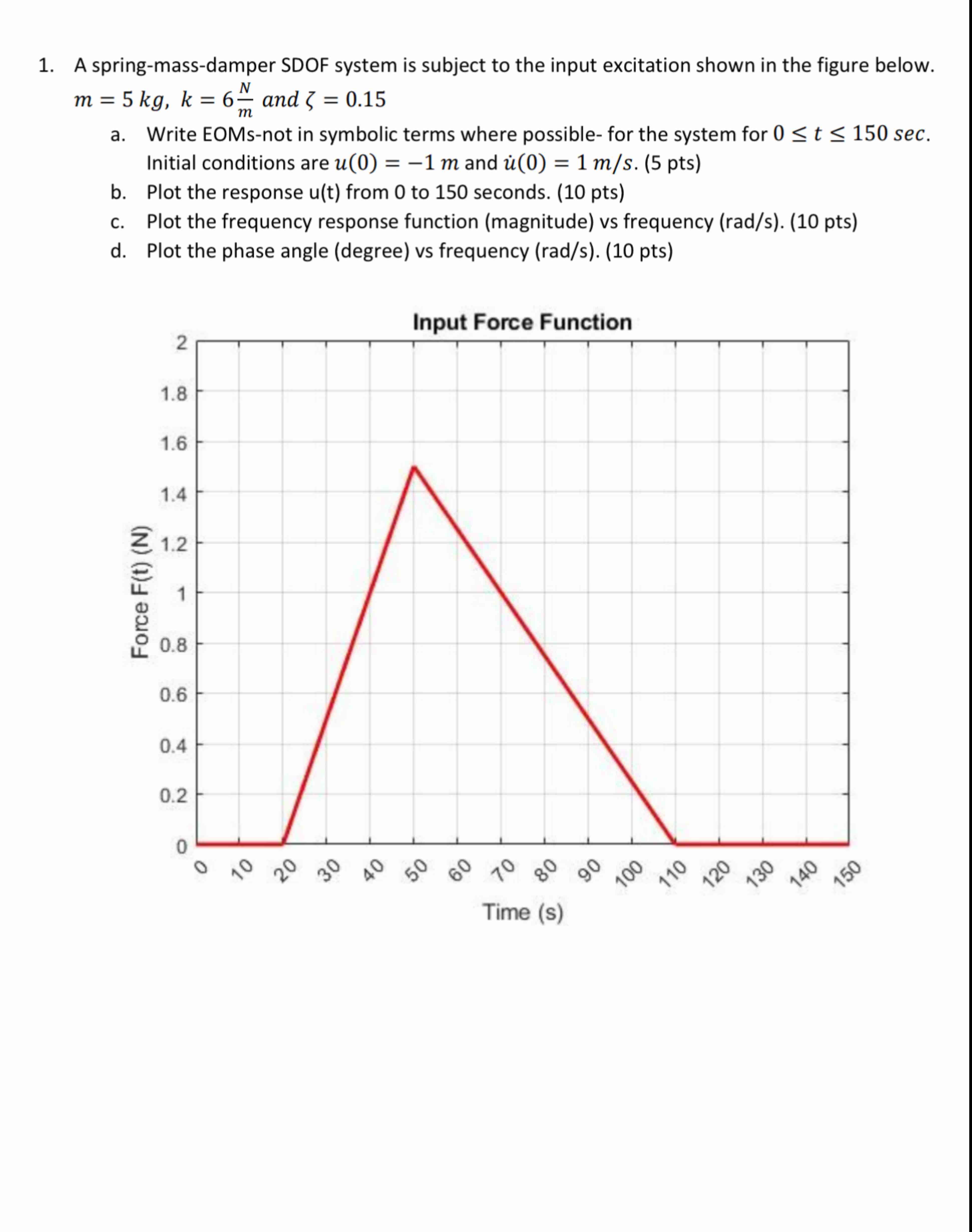 A spring-mass-damper SDOF system is subject to the input excitation shown in the figure below.