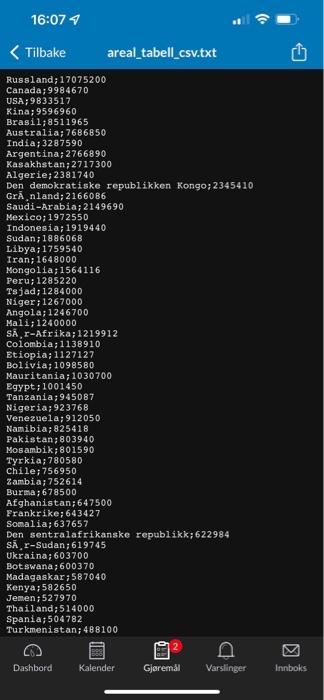 f) Read in the CSV file area_tabell_csv.txt. For each line, check whether you can find the name of the country in the dictionary from the previous subtask. If you find the name, set the area of ??the Land object equal to the area from this file. If you cannot find the country in the dictionary, write the name of the country and that you cannot find it.