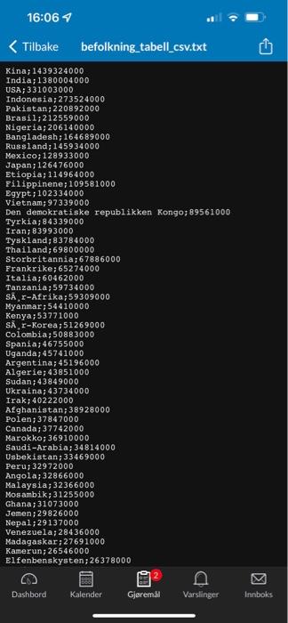 e) Read in the CSV file population_tabell_csv.txt. Create a Land object for each line in the file, with name and population given by the file, but where the area is not set yet (use default value). Put all the countries in a dictionary with name as key and the Country object as value