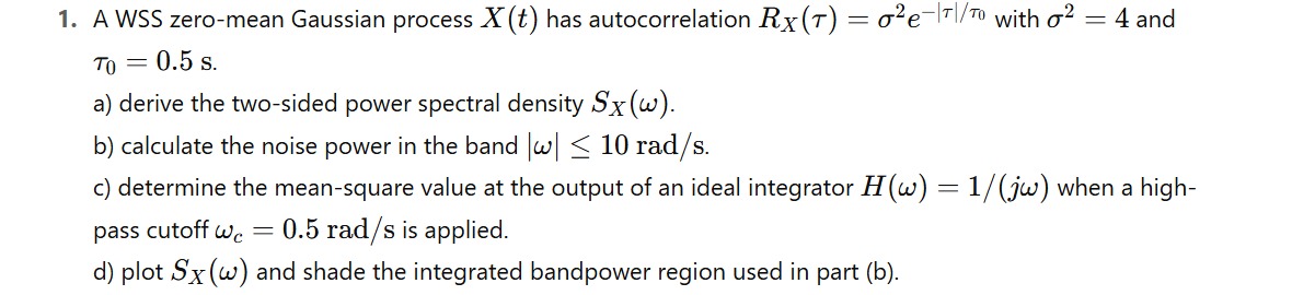 A WSS zero-mean Gaussian process x(t) has autocorrelation R_(x)(\tau )=\sigma ^(2)e^(-|\tau (|)/(\tau _(0))) with \sigma ^(2)=4 and