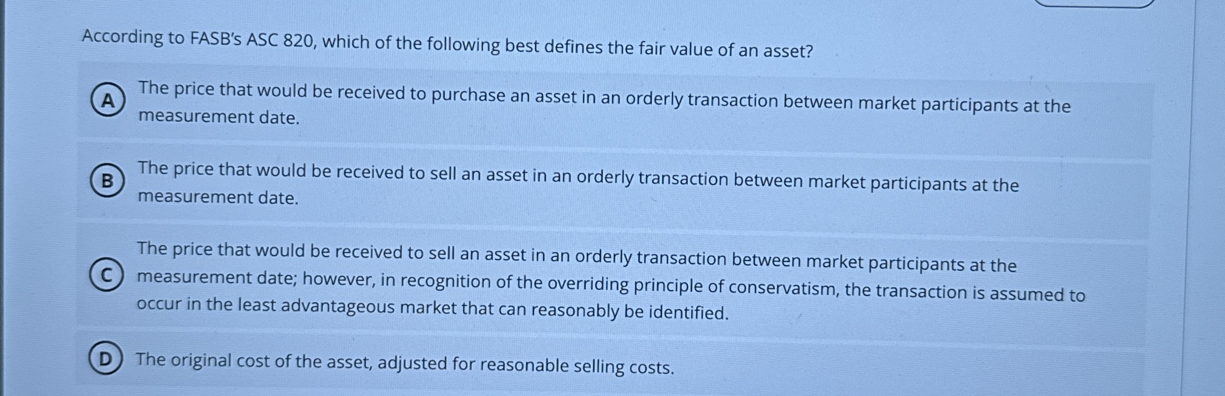 According to FASB's ASC 820 , which of the following best defines the fair value of an asset? The price that would be received to purchase an asset in an orderly transaction between market participants at the measurement date. The price that would be received to sell an asset in an orderly transaction between market participants at the measurement date. The price that would be received to sell an asset in an orderly transaction between market participants at the measurement date; however, in recognition of the overriding principle of conservatism, the transaction is assumed to occur in the least advantageous market that can reasonably be identified. The original cost of the asset, adjusted for reasonable selling costs.