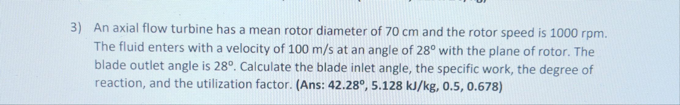 28\deg . Calculate the blade inlet angle, the specific work, the degree of reaction, and the utilization factor. (Ans: