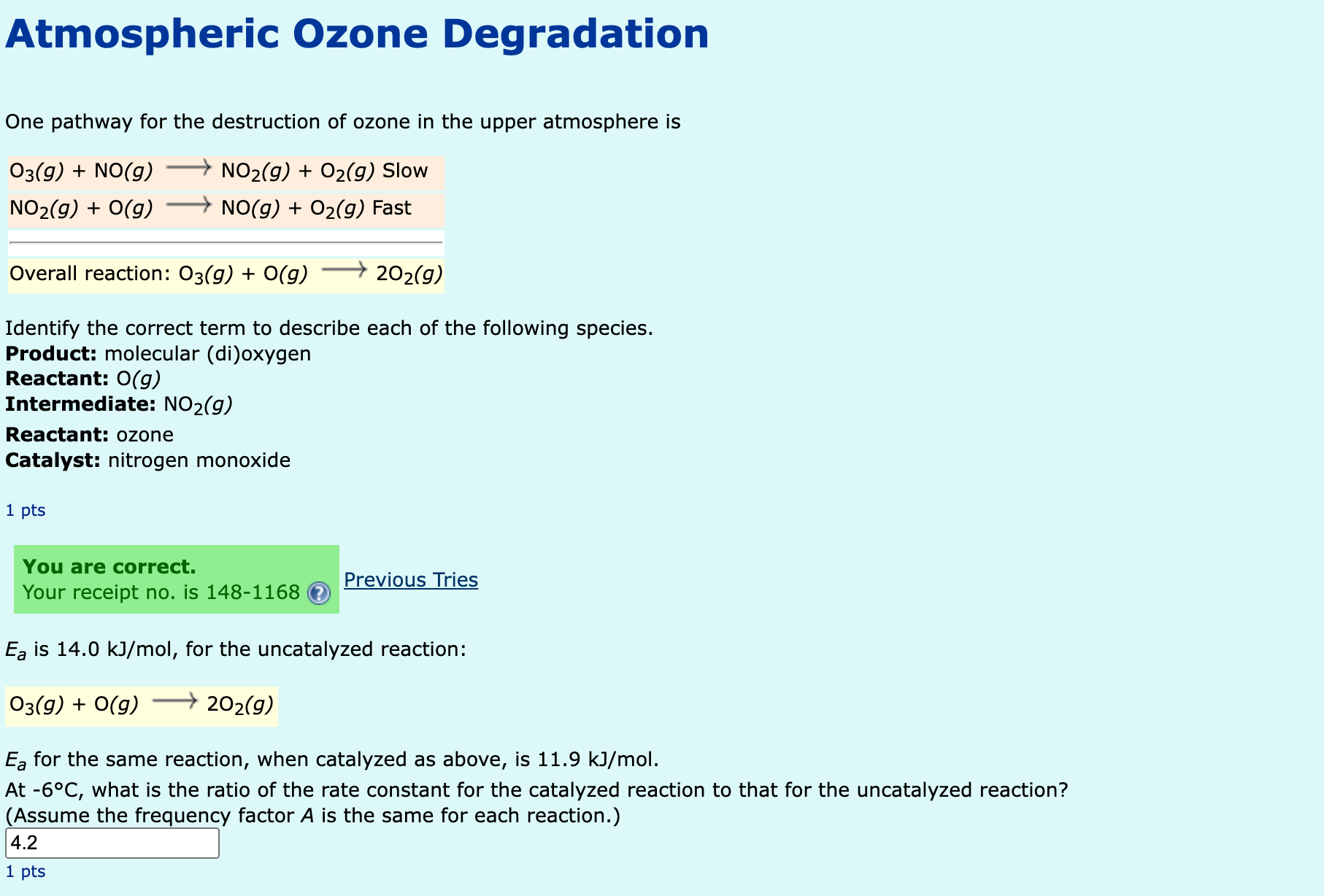 NO_(2)(g)Reactant: ozone Catalyst: nitrogen monoxide 1 pts You are correct. Your receipt no. is