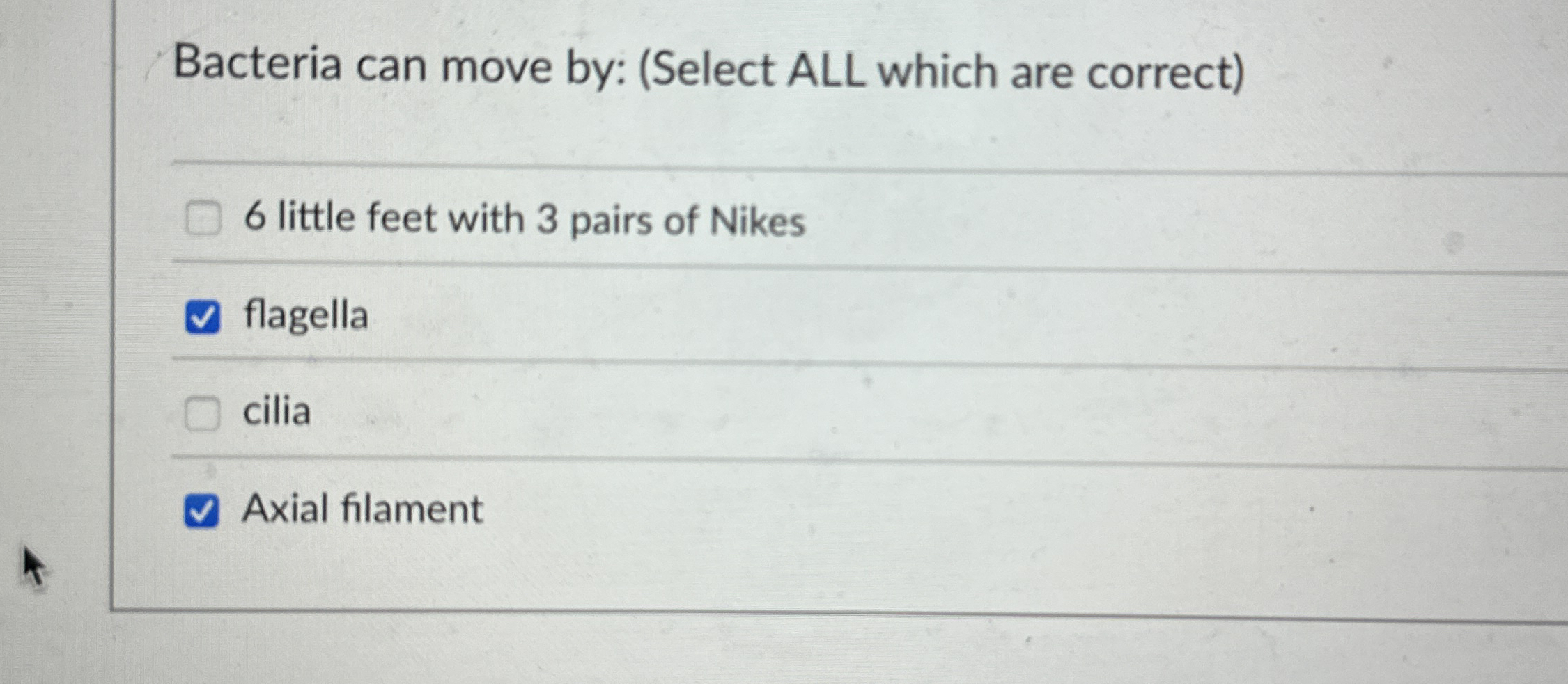 Bacteria can move by: (Select ALL which are correct) 6 little feet with 3 pairs of Nikes flagella cilia Axial filament