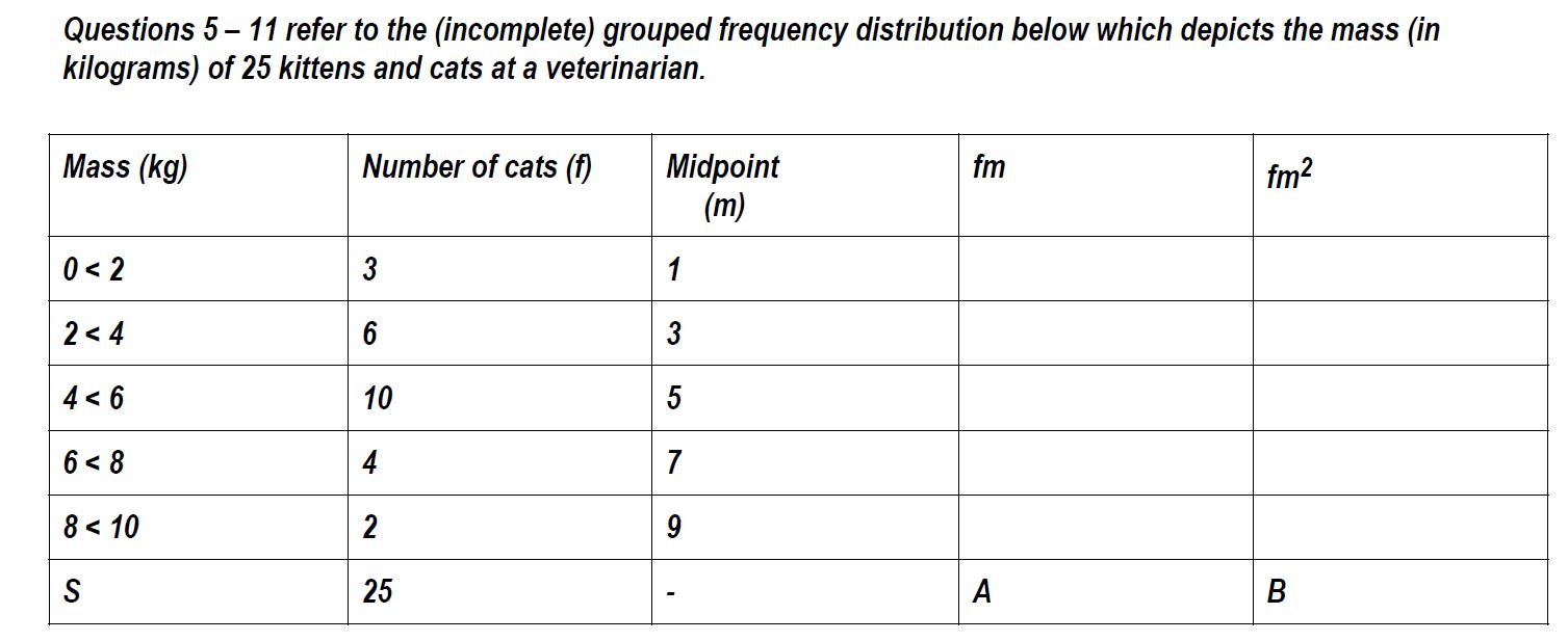 calculate the median?, grouped frequency distribution below which depicts the mass (in kilograms) of 25 kittens and cats at a veterinarian. \table[[Mass (kg),Number of cats (f),\table[[Midpoint],[(m)]],fm,fm^(2)],[0<2,3,1,,],[2<4,6,3,,],[4<6,10,5,,],[6<8,4,7,,],[8<10,2,9,,],[S,25,-,A,B]]