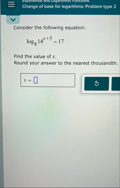 Change of base for logarithms: Problem type 2 Consider the following equation.