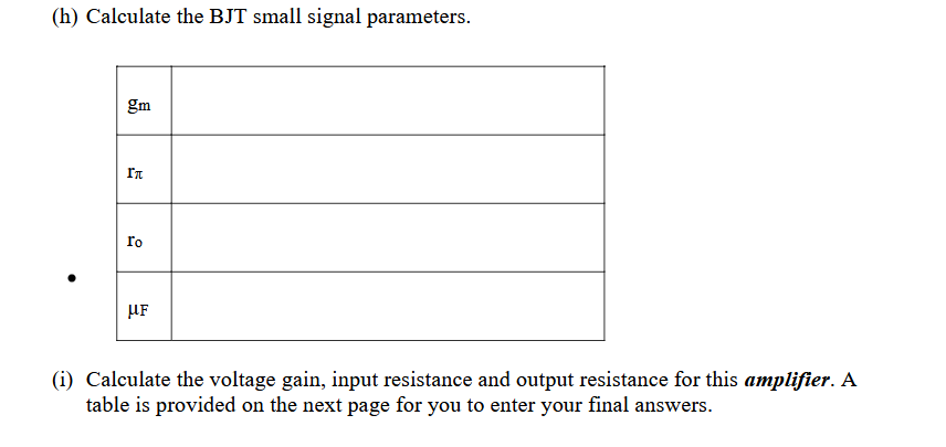 (i) Calculate the voltage gain, input resistance and output resistance for this amplifier. A table is provided on the next page for you to enter your final answers.