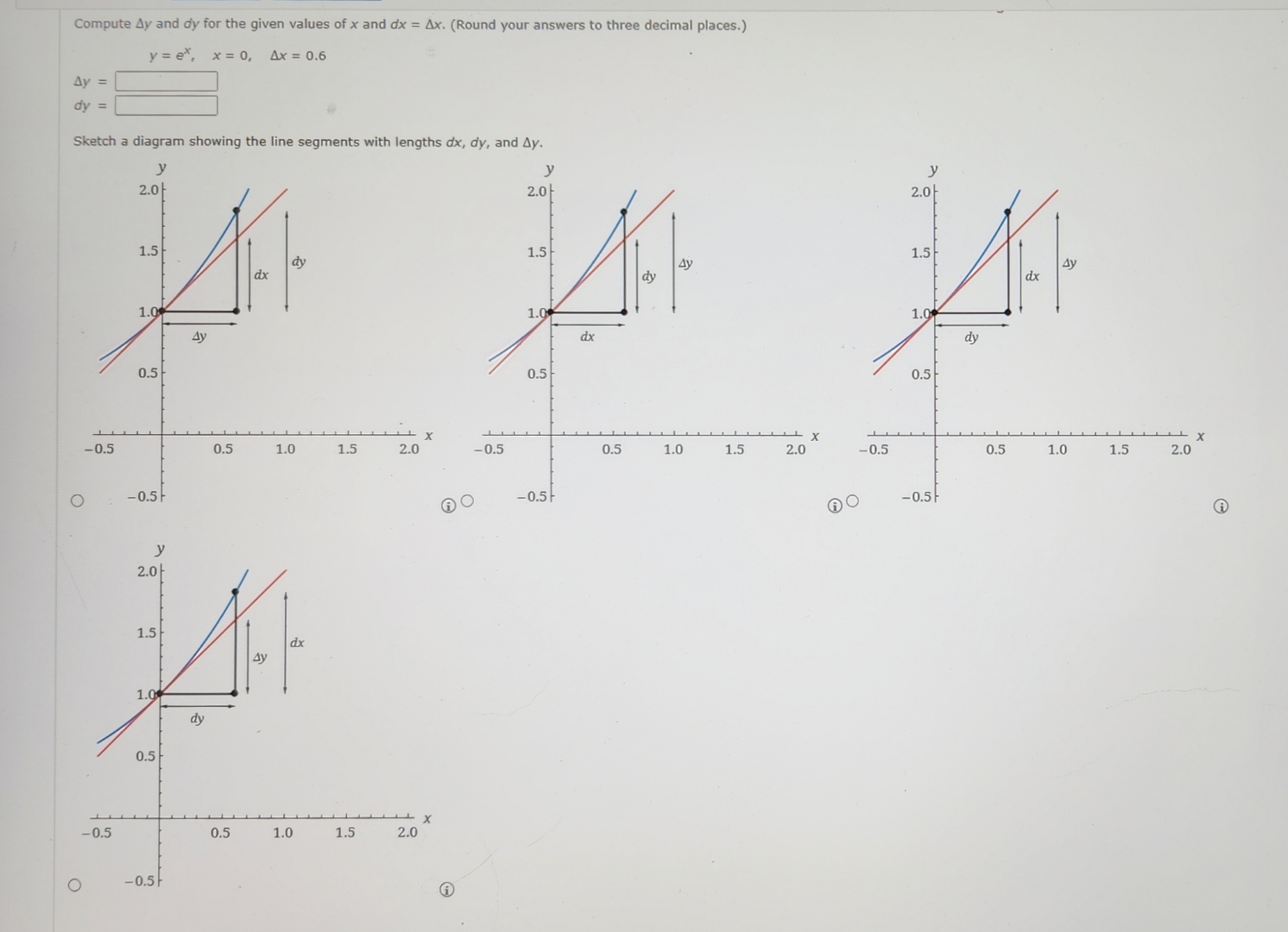 ,y=e^(x),x=0,\Delta x=0.6 \Delta y=◻ dy=