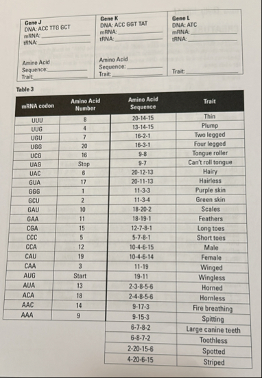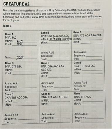 CREATURE #2 Describe the characteristics of creature 2 by "decoding the DNA" to build the proteins which make up this creature. Only one start and stop sequence is included at the beginning and end of this entire DNA sequence. Normally, there is one start and one stop for each gene.