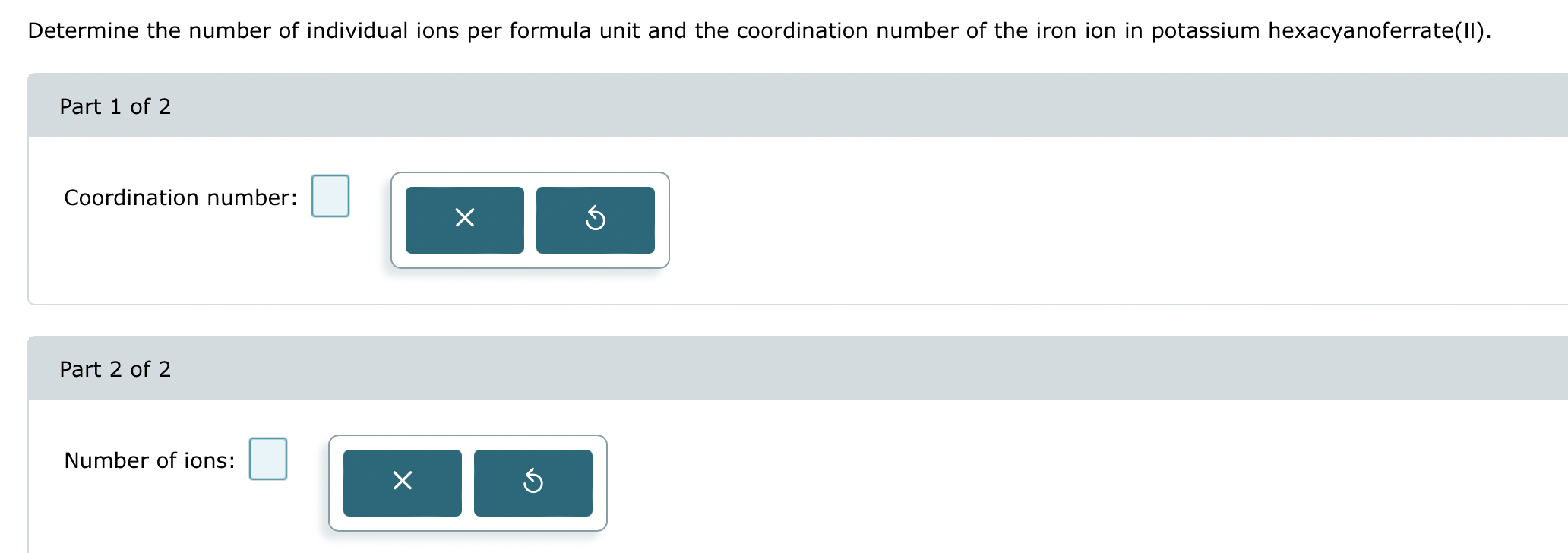 Determine the number of individual ions per formula unit and the coordination number of the iron ion in potassium hexacyanoferrate(II).