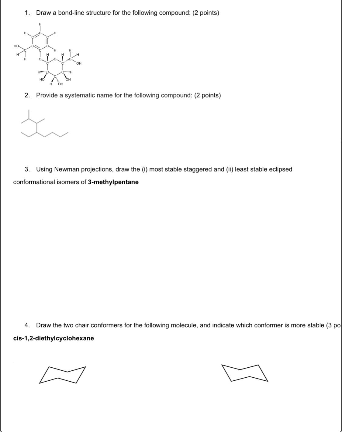 Draw a bond-line structure for the following compound: (2 points) Provide a systematic name for the following compound: (2 points) Using Newman projections, draw the (i) most stable staggered and (ii) least stable eclipsed conformational isomers of 3-methylpentane Draw the two chair conformers for the following molecule, and indicate which conformer is more stable (3 po cis-1,2-diethylcyclohexane