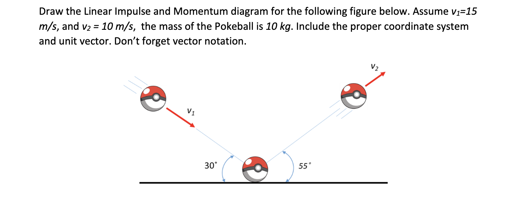 , the mass of the Pokeball is 10 kg . Include the proper coordinate system and unit vector. Don't forget vector notation.
