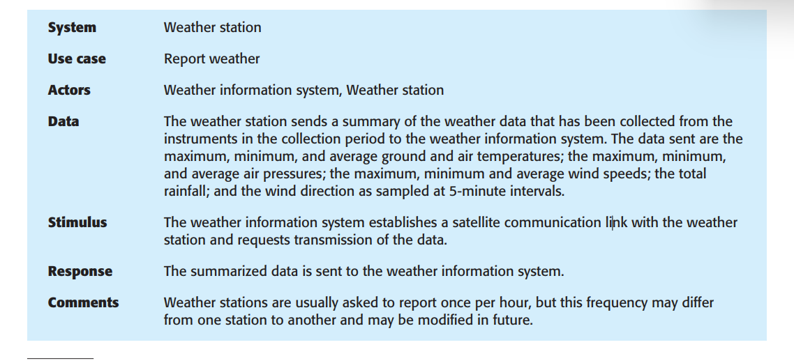 draw use case diagram for System Weather station Use case Report weather Actors Weather information system, Weather station Data The weather station sends a summary of the weather data that has been collected from the instruments in the collection period to the weather information system. The data sent are the maximum, minimum, and average ground and air temperatures; the maximum, minimum, and average air pressures; the maximum, minimum and average wind speeds; the total rainfall; and the wind direction as sampled at 5-minute intervals. Stimulus The weather information system establishes a satellite communication link with the weather station and requests transmission of the data. Response The summarized data is sent to the weather information system. Comments Weather stations are usually asked to report once per hour, but this frequency may differ from one station to another and may be modified in future.