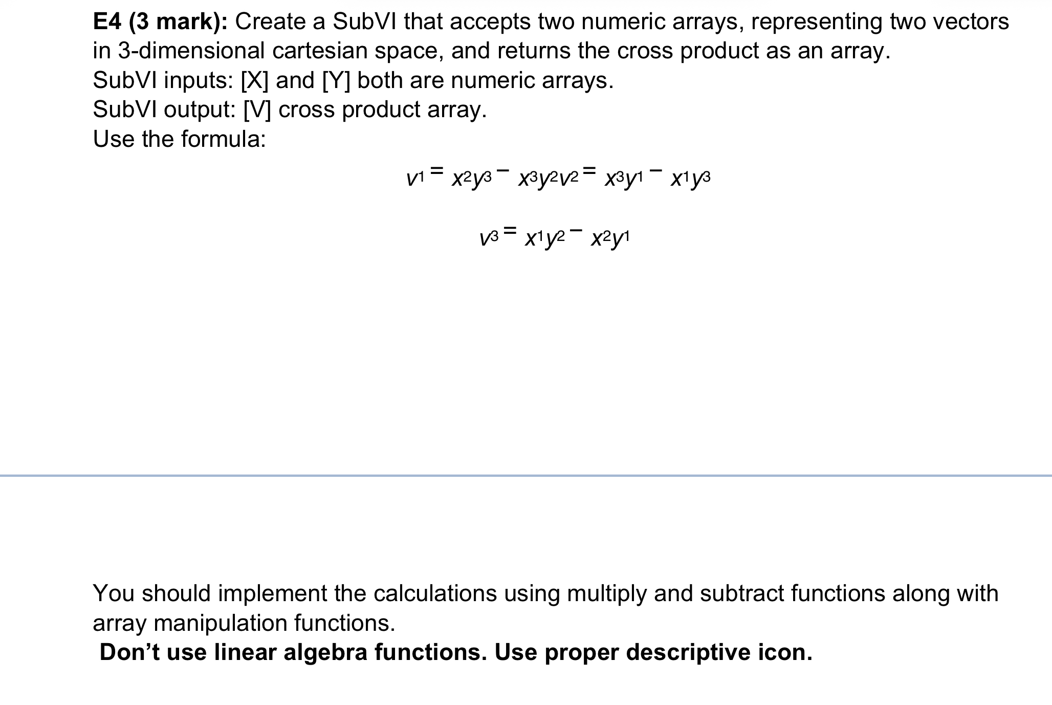 E4 (3 mark): Create a SubVI that accepts two numeric arrays, representing two vectors