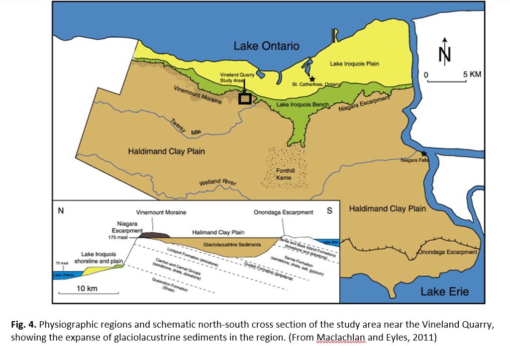 Examine GSC Map 1253A (Glacial Map of Canada), the Quaternary Geology of Ontario (above), and the surficial deposits in Niagara (Fig. 4). a) Does the Vinemount Moraine pre-date or postdate the Haldimand Clay Plain? Explain your rationale. b) Examine the paleogeographic reconstruction in Figure 5. Relate the surficial geology of the Niagara to the last readvance of the Laurentide Ice sheet into the region – which unit(s) deposited during which stadial?
