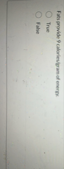(Solved): Fats provide 9 calories/gram of energy. True False ...