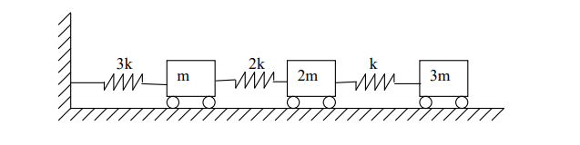 the natural frequencies of the below 3 DOF systemfundamental natural frequency of spring mass system using dunkerley's methodfirst influence coefficient for mass 2m are given as?11=(1/3k); ?22=?33=(1/3k second influence coefficients for mass 2m are given as?22=((1/3k)+(1/2k))=((2+3)/(6k)) =(k/6k) ?21=(1/3k)