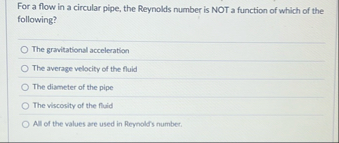For a flow in a circular pipe, the Reynolds number is NOT a function of which of the following? The gravitational acceleration The average velocity of the fluld The diameter of the pipe The viscority of the fird All of the values are used in Reynold's number.