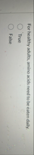 (Solved): For healthy adults, amino acids need to be eaten daily. True False ...