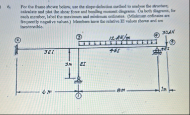 For the frame shown below,moment area method to snalyse the structure; calculste and plot the shear force and bending moment diagrams. Ou both diagrams, for each member, label the maximum and minimum ondinates. (Minimum ordinates are frequently negative values.) Members have the relative El values shown and are inextensible.