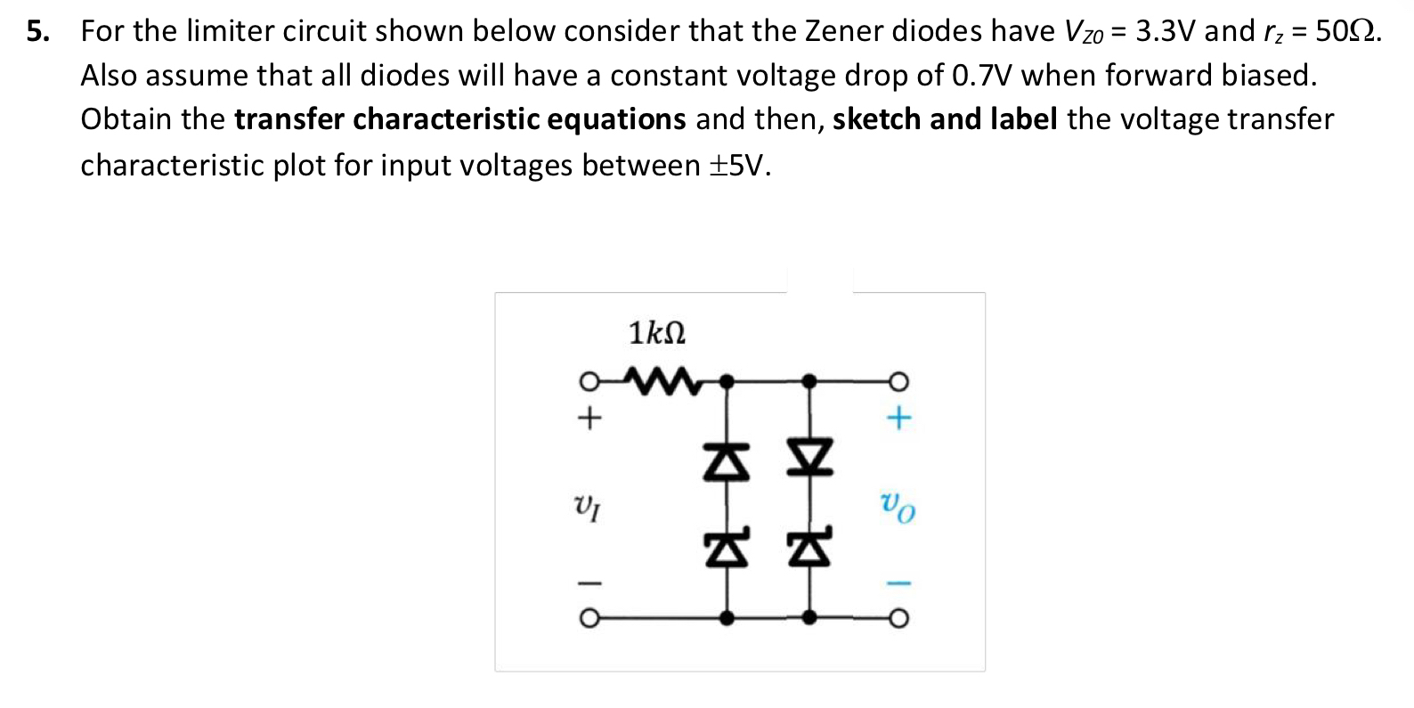 r_(z)=50\Omega . Also assume that all diodes will have a constant voltage drop of 0.7 V when forward biased. Obtain the transfer characteristic equations and then, sketch and label the voltage transfer characteristic plot for input voltages between
