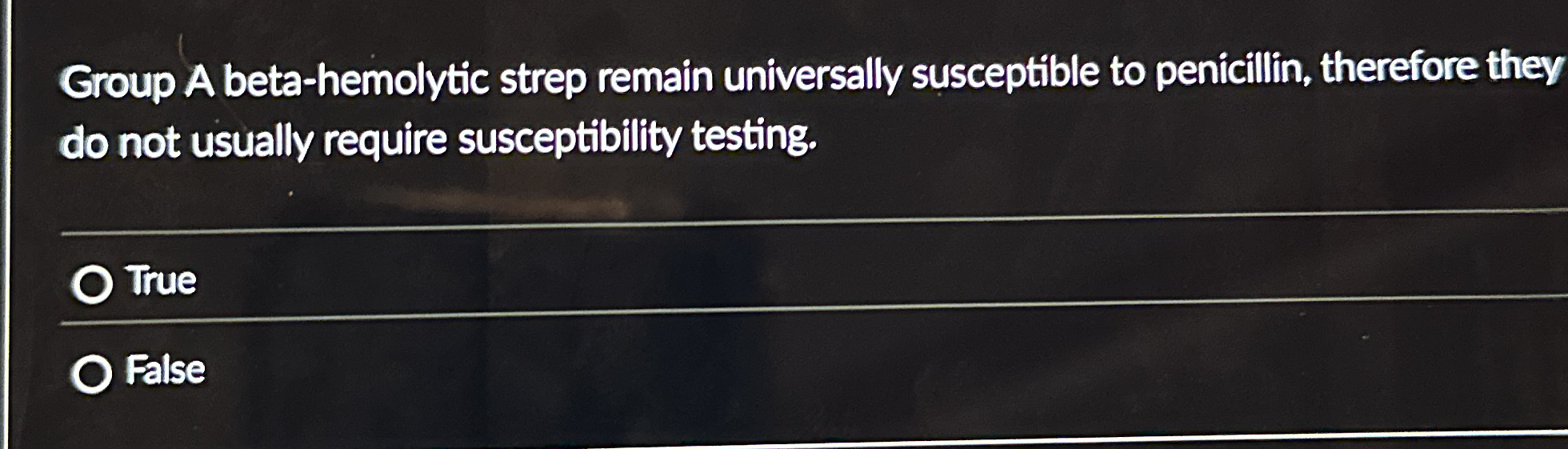 Group A beta-hemolytic strep remain universally susceptible to penicillin, therefore they do not usually require susceptibility testing. True False