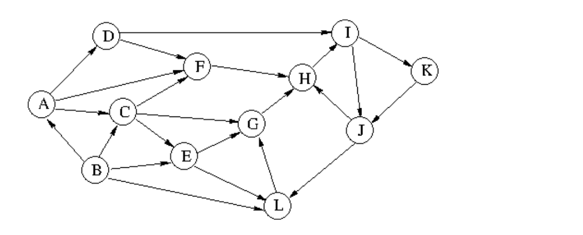 b. [3 points] Perform Breadth-First Search on the above graph and label the vertices by their distances discovered by Breadth-First Search, starting at the source vertex A.