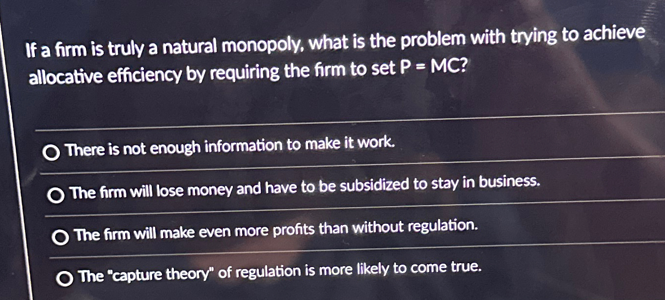 ? There is not enough information to make it work. The firm will lose money and have to be subsidized to stay in business. The firm will make even more profits than without regulation. The "capture theory" of regulation is more likely to come true.