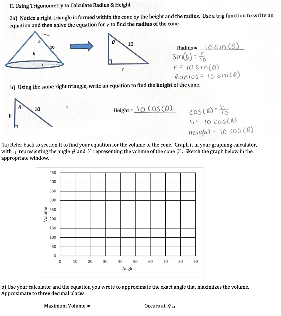 Helght =10cos(\theta )4a) Refer back to section II to find your equation for the volume of the cone. Graph it in your graphing calculator, with