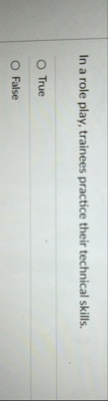 (Solved): In a role play, trainees practice their technical skills. True False ...